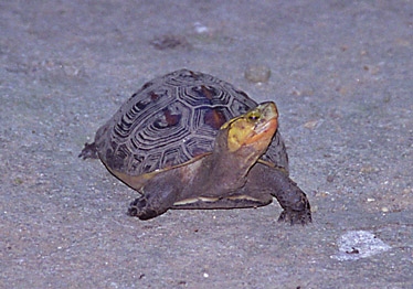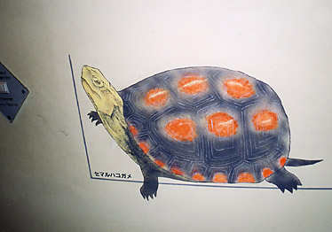 心配された台風の影響は受けずに済み、晴天に恵まれた。高速船はいよいよすべり出す。時折あっと息をのむほどのエメラルドの上に私はいた。ちょうど私が買った「みんさー織」のバッグと同じ色だった。 「あとがき」 こうして、南の島の休日は終わりました。思えば私が石垣島&西表島旅の実現まで7年もかかってしまったのは何だったのでしょう。それは私が南の島に本当にめぐり合うべき時期を待つ7年間だったように今は思えます。泣いた、笑った、きゅんとした。もしももっと早くに旅していたとしたら、出会えずに通り過ぎてしまったかもしれない数々の想いが芽生えました。旅にはいろんなかたちがあります。この旅ほどたくさんの方々にお世話になった旅は今までになかったと思います。事前情報をくださった諸先輩方、毎日私の報告メールに一緒になって喜びあってくださった先輩に厚く御礼申し上げます。白状すると、私にとってこの旅は言ってみれば自分探しの旅でした。5日間の旅で自分なりの答えを見つけて帰ってきました。教えてくれたのは明るく開放的な南の島の風人たちです。 おかげさまで、この連載も今回で無事終了することができました。ひとつの旅の紀行文を1年にもわたり執筆できたのは、それほど印象的で内容豊富な旅であったことと、各方面の皆様から励ましのお言葉をいただいたからと感謝しております。これから南の島を旅される方々にこの探鳥記が何かのご参考になれば幸せです。 最後に。同行してくれた親友sumikoへ。お疲れさま。鳥見初めての一般人にはきつい面も多々あったことでしょうに文句も言わずついてきてくれてありがとう。私ではつい見逃してしまうような新鮮な感覚と鋭い視点に驚かされました。後日談になりますが、焼き増ししたたくさんの記念写真スナップの中からセマルハコガメが偶然写っているのを発見したのは彼女でした。この件に関しては西表野生生物保護センターで撮っておいた壁画の写真が大いに役に立ちました。天然記念物を知らず知らずのうちに実は見ていたなんて、帰ってからの思いがけない大きなおみやげがうれしくて、ふたりで歓喜の声をあげました。親友に敬意を表し、そのセマルハコガメの写真をトリミングして贈ります。 2003年7月 yukiより