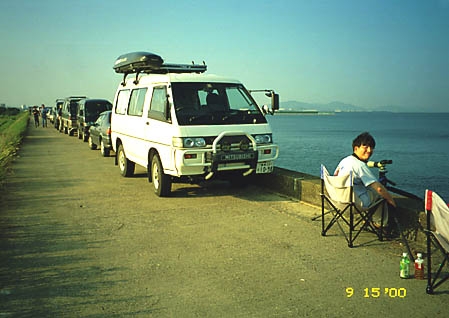 9月15日、朝6時に現着するがポイントの堤防の上は車の縦列、場所とりの人々で溢れかえり、それはもうフェスティバル状態。強豪ぞろい有名どころがずらり、写真家M氏、奈良のKさんを始め、京都のIさん、大阪のTさん、Mさん…その素晴らしい面々を拝ませていただけるだけでもここへ来た価値は充分だ。3連休ということもありピーク時にはおよそ100人ほどの人々でごった返した。写真家Y氏、西三河のSさんは地元であり、既に撮影を済ませているため余裕の表情である。しかしこの日ワライカモメはとうとう皆の前には姿を見せなかった。あきらめて帰る人、もう1泊して再挑戦を考える人…私達は急遽駅前のビジネスホテルに泊まることを決めた。ホテルのエレベーターで偶然乗り合わせたバーダーの方と言葉を交わす。お互い「今日はダメでしたね。」と。彼のちょっとがっかりした表情が印象的だった。